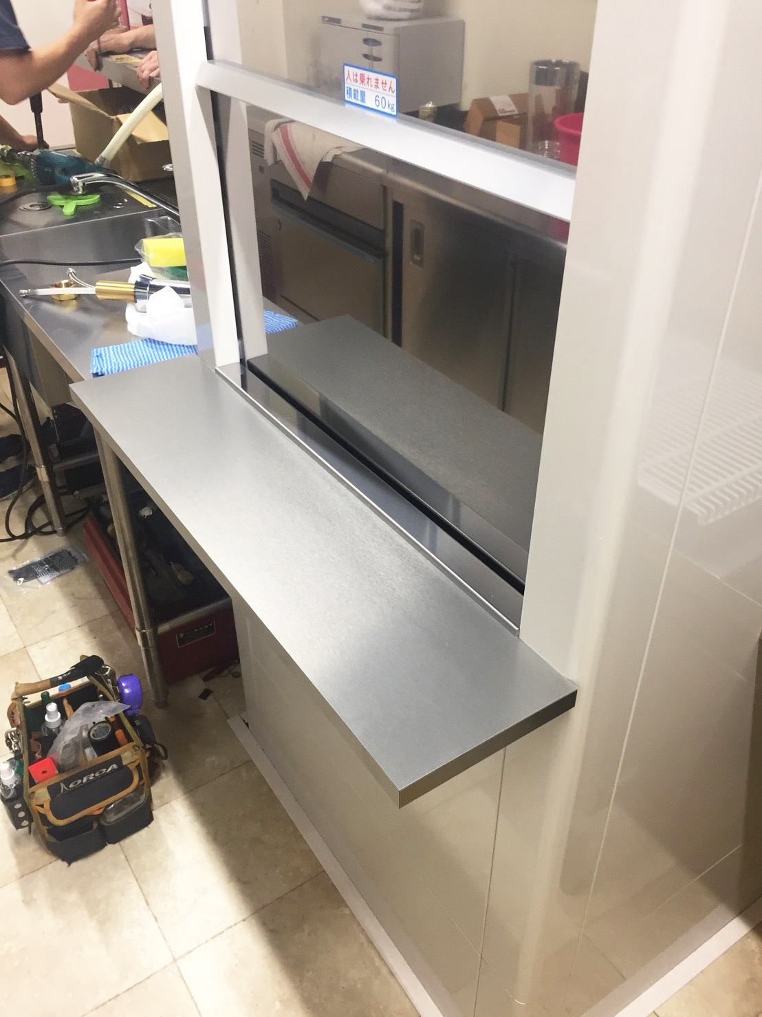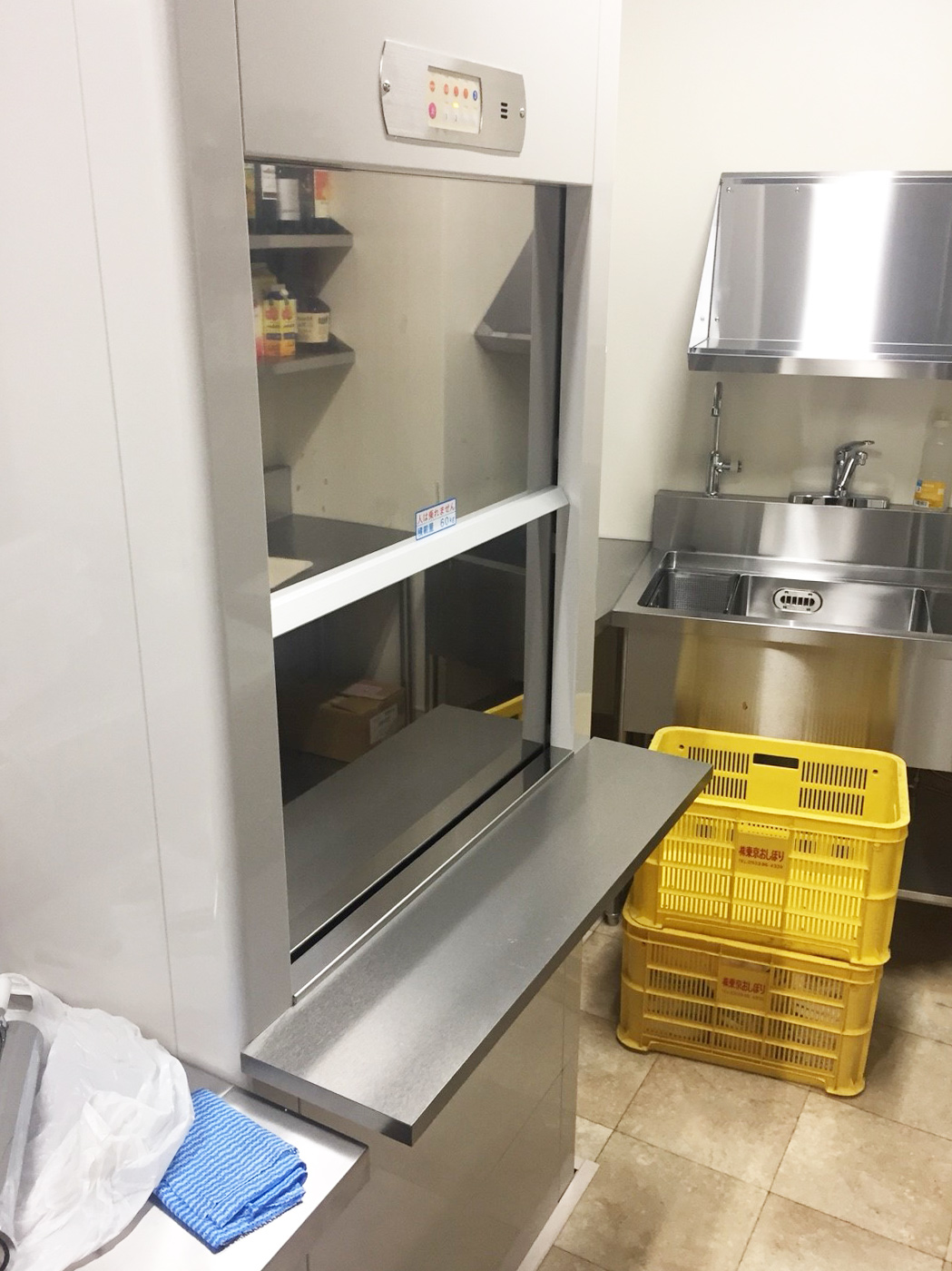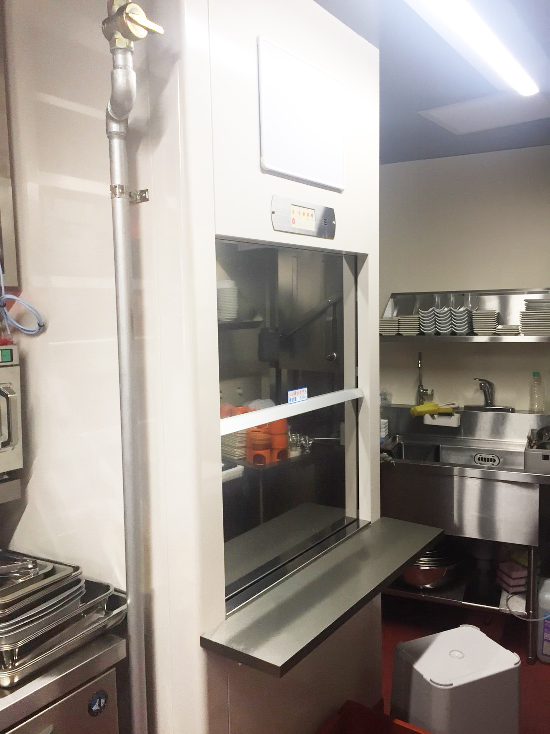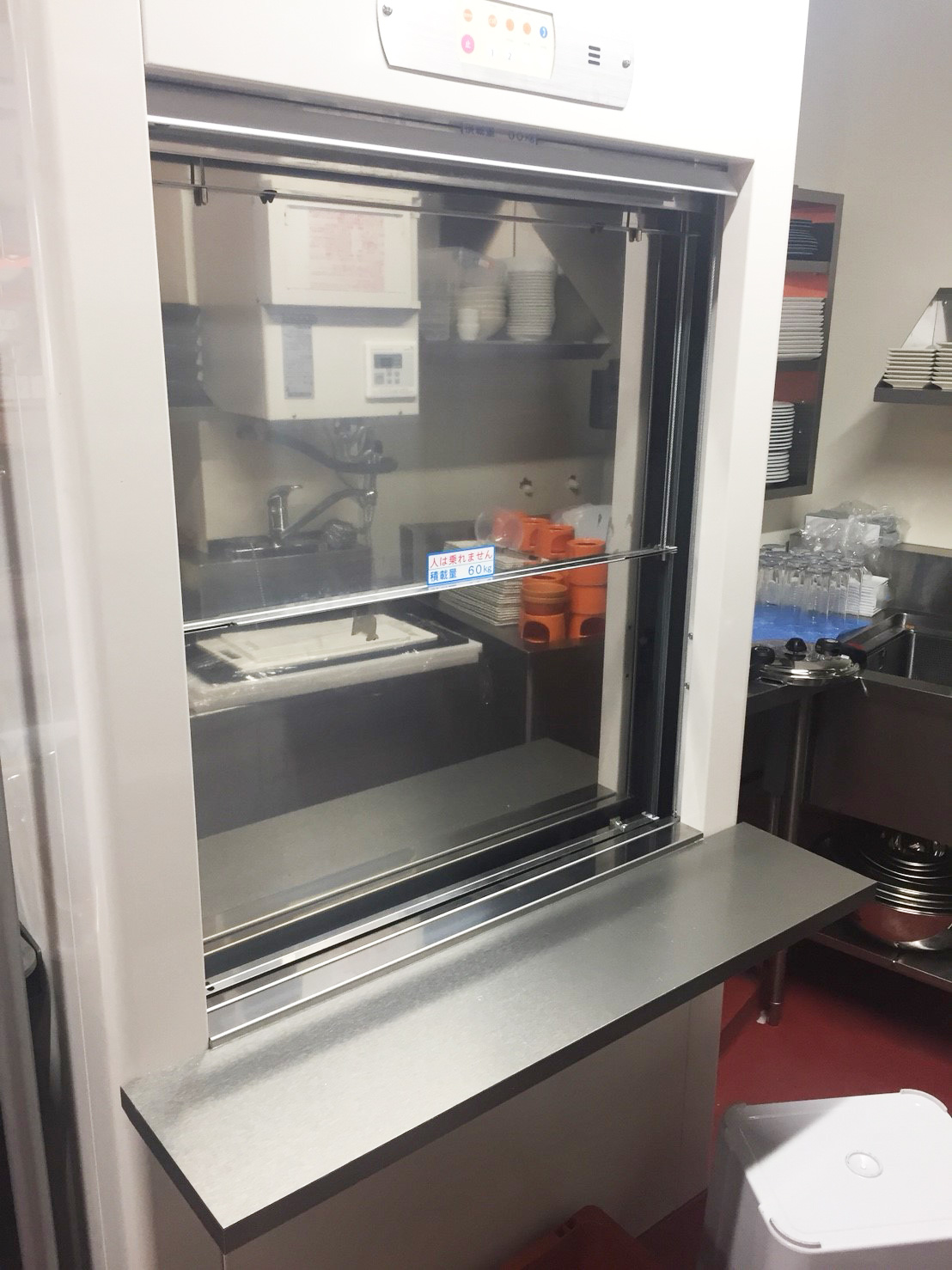 このようなお店では、料理を効率よく運ぶことが大切になります。設置したダムウェーターは700Gタイプで、積載荷重は60kg仕様のものです。