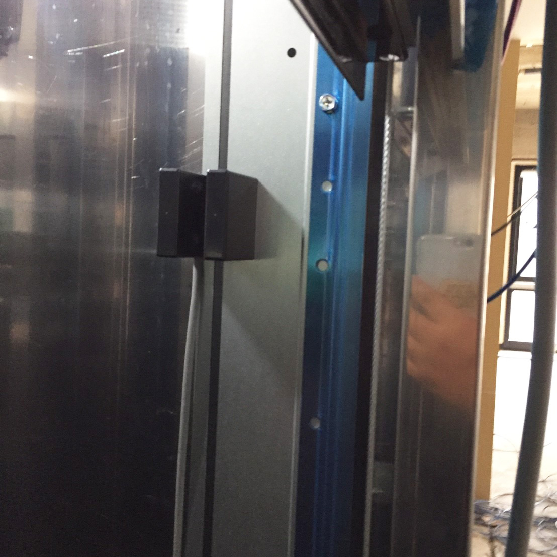 写っている黒色の部品が「近接スイッチ」です。こちらをカゴが通過することで、減速の制御を行います。
