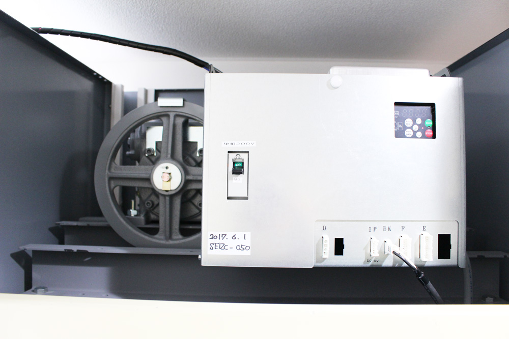 小荷物専用昇降機 設置の流れ7こちらが制御盤と巻上機の写真。手前にあるのが制御盤で、奥に見えるのが巻上機です。